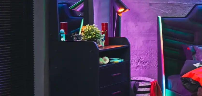 Oyun dünyasının enerjisini yaşam alanına taşıyan güçlü bir tasarım… Roox Raven Genç Odası, gamer ruhunu yansıtan dinamik ve yenilikçi bir konsept sunar.
